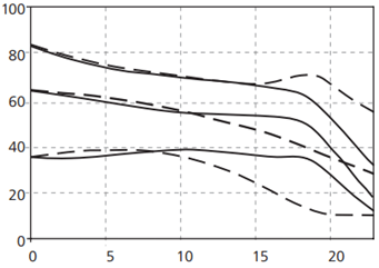 Meet the MTF Graph. The Modulation Transfer Function is a graph to analyze the capability of a lens to express resolution. It is part of a very specific (and not very important) technical aspect of lenses. Once you know it, it`s pretty useful to understand lens issues. If you want to know more, just google MTF Graph and have a blast. Here I`ll just state the essential: the upper and continuous lines are the most important ones as they capture the gross detail that a lens can reproduce. The vertical axis is the capability (from 0 to 100 or from 0 to 1) and the horizontal axis shows the lens from the middle (represented by the number 0) to the extreme corner (represented by the twenty something).